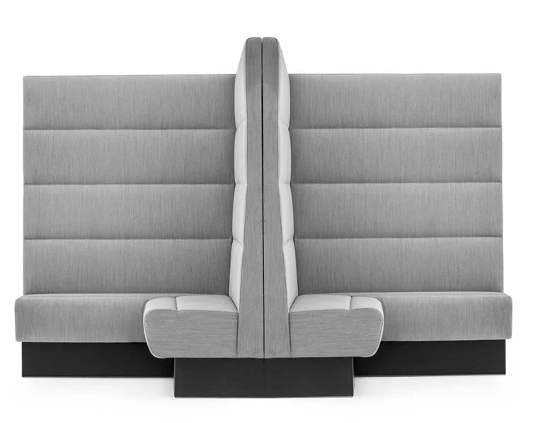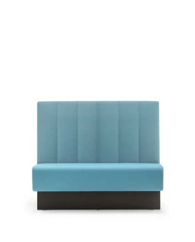 Sistema di panche modulari imbottite, con moduli angolari, rettilinei e curvi, schienali a varie altezze, opzioni mono e bifacciali, possibilità di struttura in legno con piedini regolabili.
